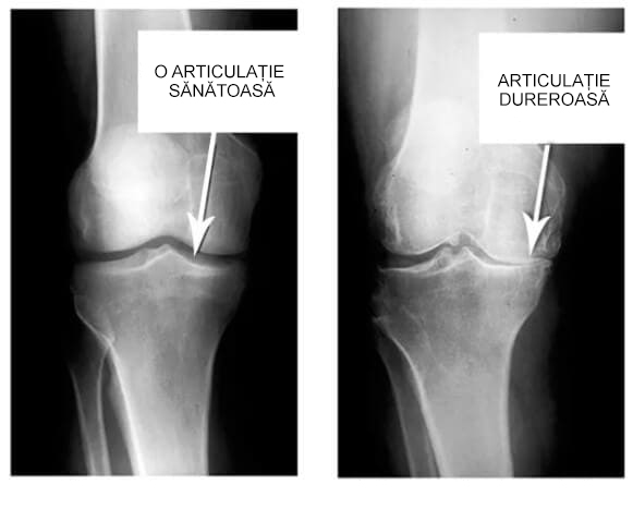 Uitați-vă la aceste imagini, puteți vedea că în imaginea din dreapta nu există un spațiu articular, oasele se freacă una de alta, provocând multă durere. Iar acest proces este foarte greu de oprit!
